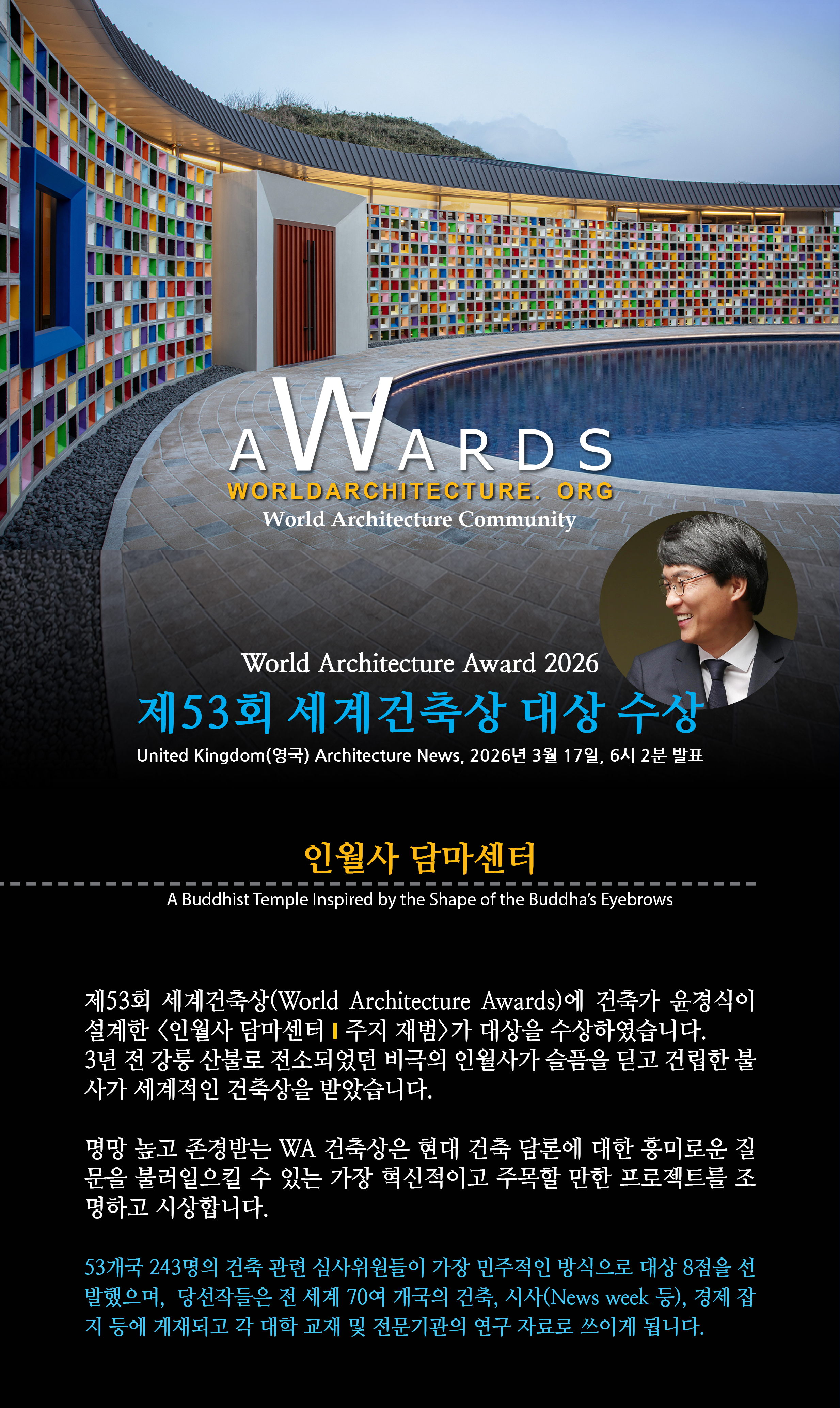 위기를 작품으로, 시간을 가치로 바꾸신 위대한 여정입니다. 세계건축상 대상 수상을 진심으로 축하드립니다. 인월사 담마센터 경이롭습니다