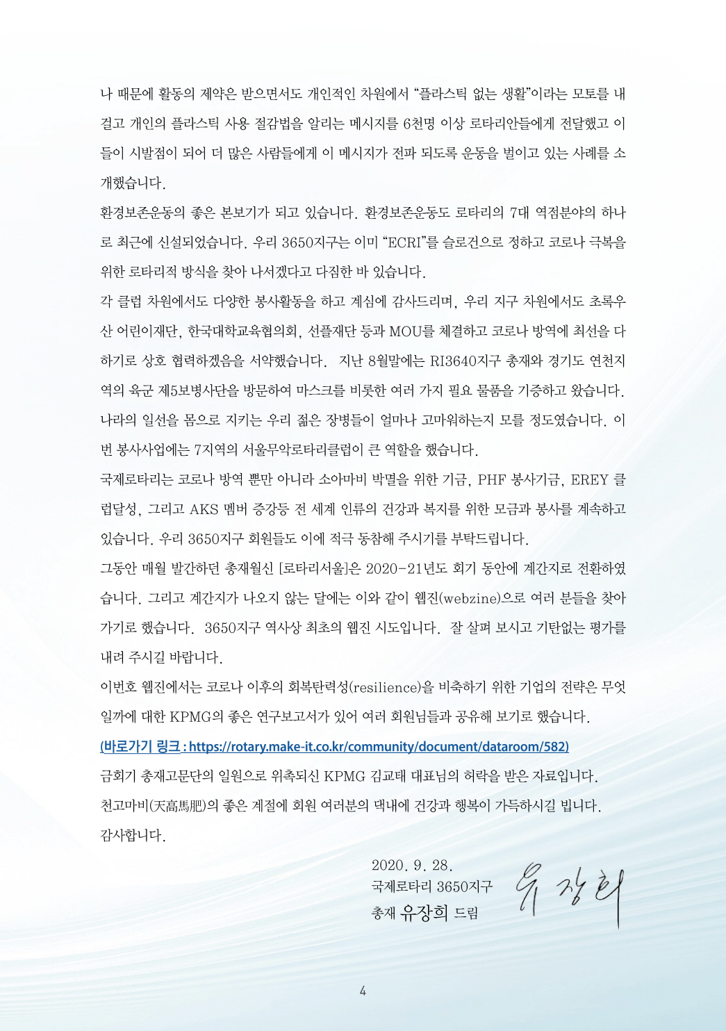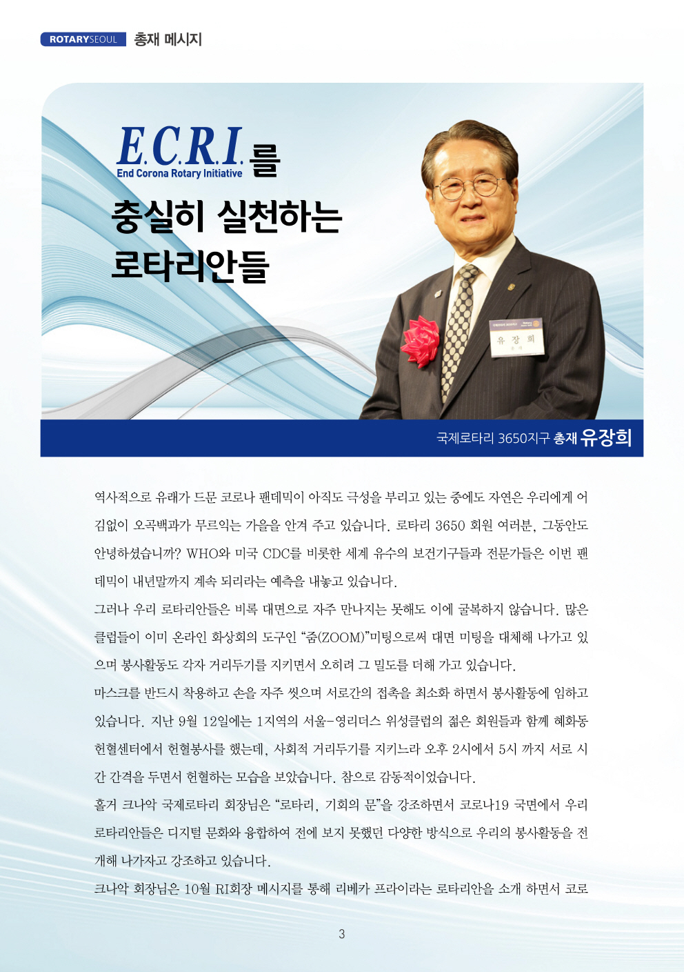 그동안 매월 발간하던 총재월신 [로타리서울]은 2020-21년도 회기 동안에 계간지로 전환하였습니다. 그리고 계간지가 나오지 않는 달에는 이와 같이 웹진(webzine)으로 여러 분들을 찾아 가기로 했습니다. 3650지구 역사상 최초의 웹진 시도입니다. 잘 살펴 보시고 기탄없는 평가를 내려 주시길 바랍니다.