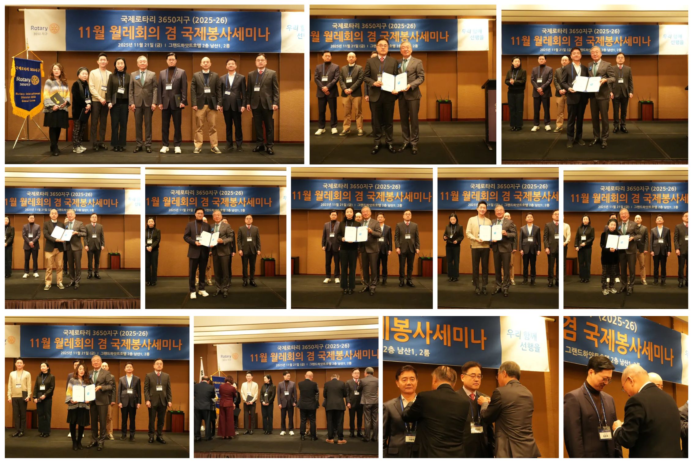 국제로타리 3650지구(총재 김종문)는 2025년 11월 21일(금) 오전 7시 20분, 그랜드하얏트서울 남산룸에서 11월 월례회의 및 국제봉사세미나를 개최했다. 총재단, 지역대표, 클럽 회장단, 임원, 신입회원 등 다수의 로타리안이 참석한 가운데 조찬과 친교로 시작된 행사는 '총재님 밥사주세요' 영상 상영으로 분위기를 활기차게 열었다.