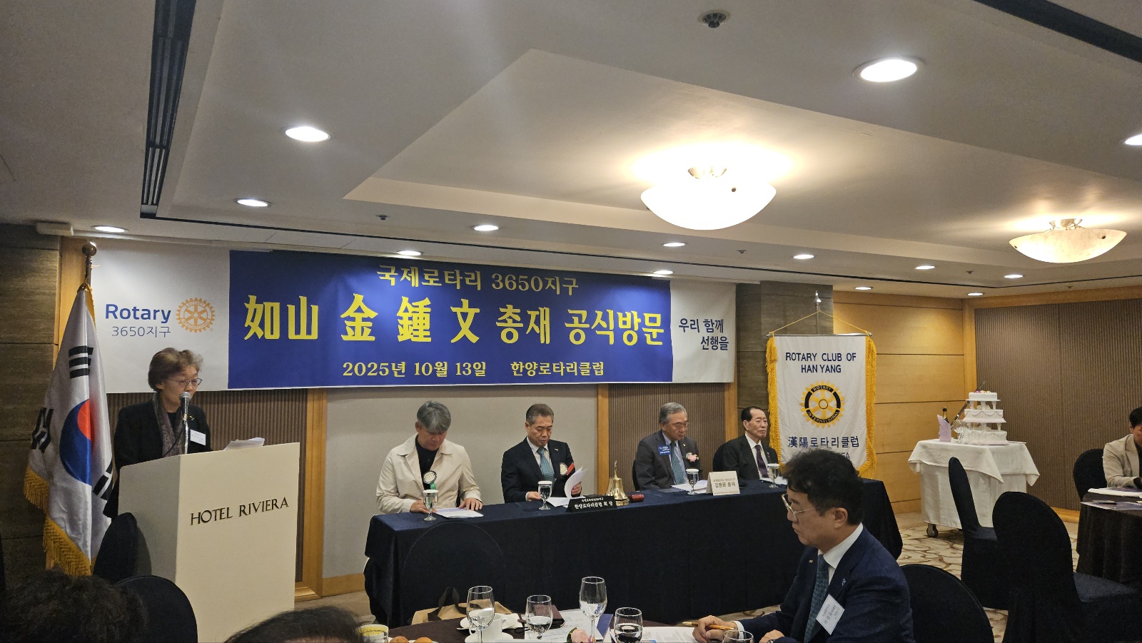 한양로타리클럽(회장 학산 홍성제)은 지난 10월 13일(월) 오후 6시, 청담 리베라호텔 2층 헤라홀에서 국제로타리 3650지구 여산 김종문 총재 공식방문주회를 성황리에 개최하였습니다.